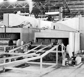 合板は低温乾燥を主とするために、熱源は主としてスチームを使用します。目止め、ベースコート、トップコートと、数回の塗布乾燥を繰返します。塗布量の多い処理に対しては、フラットに流して予熱部を通した後、ウィケットコンベアーにより立て流しを行い、完全に硬化させます。いずれも連動受渡し機構による連続自動処理乾燥装置です。
